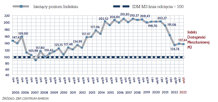 Mieszkaniowej brana jest kwota niższa) spadł o 1,58%. Po uwzględnieniu wzrostu cen mieszkań, wysokość indeksu dostępności mieszkaniowej w II kwartale 2023 roku nieznacznie spadła,